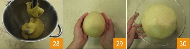 et travaillez pendant environ 5-6 minutes. La pâte est prête dès qu'elle s'accroche et se présente lisse et élastique 28. Boulez à nouveau la pâte 29 et transférez-la dans un bol. Couvrez avec un film plastique et laissez reposer dans le four éteint avec une casserole d'eau chaude pendant une heure 30.