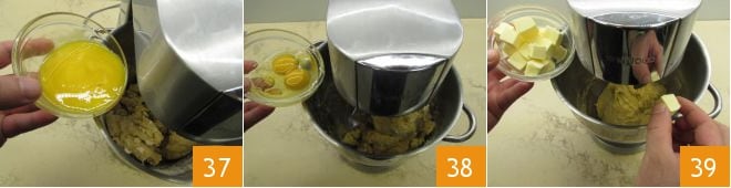 Activez le robot pendant 3-4 minutes à vitesse moyenne et ajoutez ensuite les jaunes d'œufs 37 puis les œufs 38, continuez à mélanger jusqu'à complète absorption. Cela prendra quelques instants pour qu'ils se mélangent au reste de la pâte. Ensuite, versez le beurre à température ambiante coupé en morceaux et laissez-les bien s'incorporer 39,
