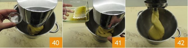 assaisonnez avec le sel 40 et enfin avec l'arôme panettone, cela prendra quelques minutes avant qu'il ne soit correctement incorporé 41. La pâte est prête dès qu'elle se présente moelleuse et lisse et qu'elle s'est accrochée au crochet 42.