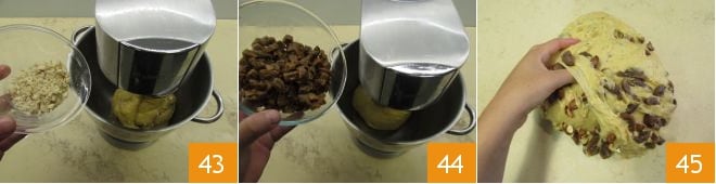 Vous pouvez ajouter les amandes hachées 43 et les figues bien égouttées 44. Laissez la machine travailler pendant 3 minutes avant de détacher le crochet et de vous déplacer sur le plan de travail pour travailler le mélange pendant quelques instants à la main : il n'est pas nécessaire de graisser le plan car la pâte libérera beaucoup de graisse 45.