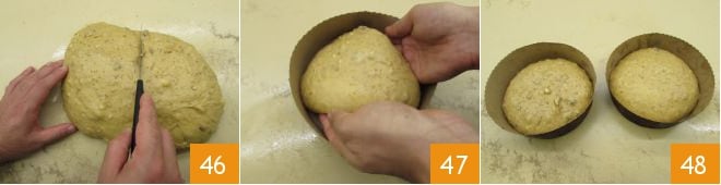 Divisez la pâte en deux morceaux d'environ 1150 g chacun 46. Comme avant, boulez-les tous les deux puis transférez-les dans des formes en carton basses et larges pour des panettones de 1 kg 47. Laissez-les lever pendant 3 heures dans un four éteint avec une casserole d'eau bouillante 48.