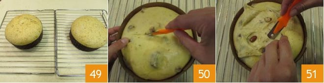 Une fois le temps nécessaire pour que les panettones lèvent 49, reprenez-les et laissez-les à l'air libre pendant 10 minutes. Déplacez-les sur la grille et incisez la surface en formant une croix avec une lame de rasoir 50. Ouvrez bien les côtés avec la lame tout en maintenant les bords levés 51.