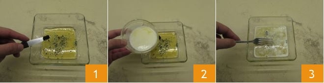 Pour préparer le panettone aux figues et amandes, commencez par l'arôme : dans un bol versez le miel, effeuillez le thym et parfumez ensuite avec les graines de la gousse de vanille extraites avec un couteau 1, versez le beurre fondu encore chaud 2 enfin mélangez bien le tout avec une fourchette 3.