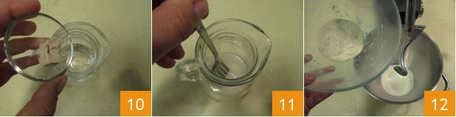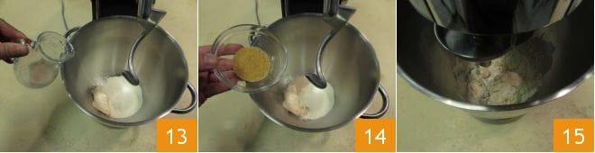 puis l'eau avec la levure 13, le sucre 14 et activez le crochet pendant 1 minute à vitesse moyenne 15.