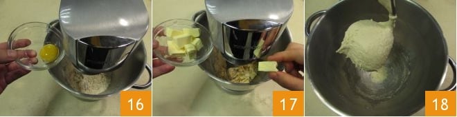 Avec le crochet toujours en fonction, ajoutez le jaune d'œuf et travaillez encore pendant 1 minute 16. Ensuite, incorporez le beurre petit morceau par petit morceau et travaillez pendant 5-8 minutes ou jusqu'à ce que la pâte soit lisse et compacte 17. De plus, elle devra s'accrocher littéralement au crochet 18.