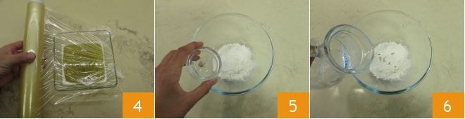 Couvrez avec un film plastique et laissez à température ambiante 4. Pendant ce temps, versez la farine dans un bol, émiettez-y la levure 5 et versez l'eau à température ambiante 6.