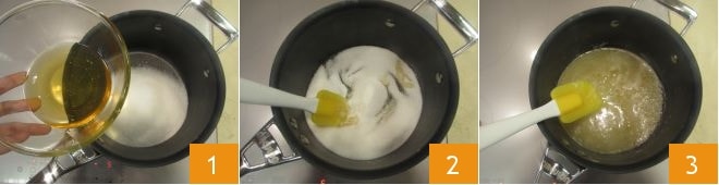 Pour préparer le panforte, commencez par verser le sucre et le miel dans une petite casserole 1; puis mélangez 2 jusqu'à ce qu'il soit fondu 3.