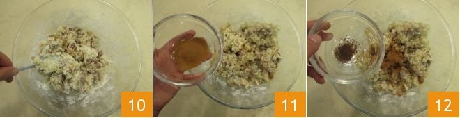 en continuant à mélanger avec une cuillère 10. Ne vous inquiétez pas si la pâte semble trop ferme, c'est normal. À ce stade, ajoutez une pincée de cannelle 11, les clous de girofle finement moulus 12, la coriandre