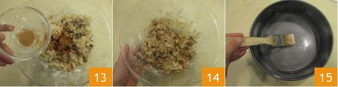 et la muscade en poudre 13. Mélangez à nouveau le tout, à la main si c'est plus pratique pour vous, pour bien amalgamer les ingrédients 14; vous devrez le travailler assez vigoureusement. À ce stade, beurrez un moule à charnière de 20 cm de diamètre 15