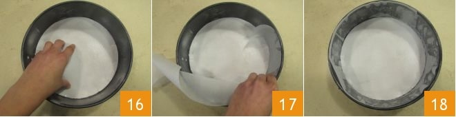 et placez la feuille d'hostie au fond 16. Ensuite, découpez une bande de papier sulfurisé de la largeur du moule et de la même longueur que la circonférence: utilisez-la pour tapisser toute la circonférence du moule (17-18).