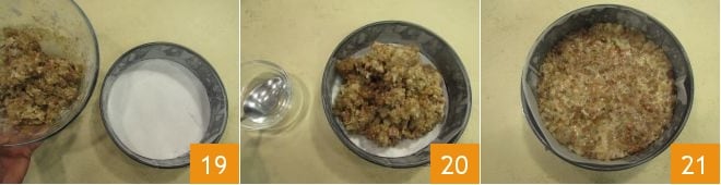 Versez le mélange dans le moule 19, puis plongez une cuillère dans un petit bol d'eau et nivelez la surface du gâteau avec le dos de la cuillère, en continuant à l'humidifier au besoin: en mouillant la cuillère, vous n'aurez pas de problème à presser la surface du gâteau pour répartir la pâte uniformément sur tout le moule (20-21).