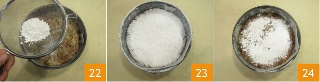 Saupoudrez le panforte d'environ 10 g de sucre glace (22-23), il doit être parfaitement recouvert. Faites cuire dans un four statique préchauffé à 220° pendant environ 10 minutes. Passé ce temps, sortez le panforte du four 24 et laissez-le tiédir seulement quelques minutes; il ne doit pas être froid sinon vous ne pourrez pas le démouler.