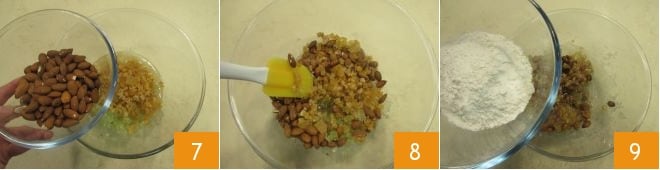 ainsi que les amandes 7. Mélangez le tout 8, puis incorporez également la farine 9