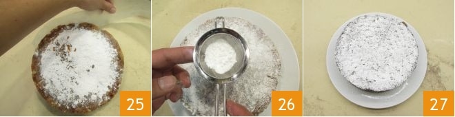 Après cela, démoulez le panforte 25, retirez le papier sulfurisé et saupoudrez à nouveau de sucre glace 26 avant de le servir 27.