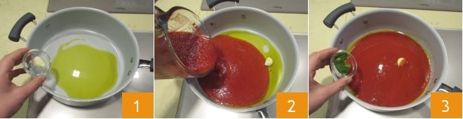 Pour réaliser les pâtes Père Noël, commencez par préparer la sauce : chauffez l'huile d'olive dans une casserole, ajoutez la gousse d'ail 1 et faites-la revenir pendant quelques minutes, puis versez la purée de tomates 2, ajoutez les feuilles de basilic 3, salez à votre goût et laissez cuire à feu doux pendant environ 25 minutes.