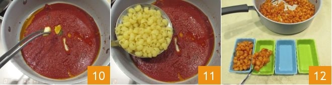 Pendant ce temps, retirez l'ail de la sauce tomate 10 et réservez environ une louche de côté, puis préchauffez le four statique à 240°. Après 5 minutes, égouttez les pâtes, ajoutez-les à la sauce dans la poêle 11 et faites-les sauter brièvement à feu vif pour bien les mélanger au condiment. À ce stade, transférez les pâtes dans les 4 cocottes, en les divisant équitablement 12.