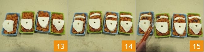 Ajoutez une cuillère à café de la sauce que vous avez réservée sur les lanières de mozzarella pour créer le chapeau 16 et enfin, placez en haut le petit cercle de mozzarella que vous aviez découpé pour la bouche, en guise de pompon du chapeau 17. Maintenant, enfournez les cocottes dans le four préchauffé à 240° pendant 4-5 minutes jusqu'à ce qu'elles forment une croûte appétissante 18 : vos pâtes Père Noël sont prêtes à être servies !