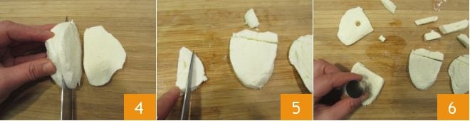 Pendant que la sauce mijote, mettez à bouillir une casserole d'eau salée pour les pâtes et passez à la préparation des autres ingrédients : coupez la mozzarella en tranches 4, puis découpez des lanières à partir d'une des extrémités des tranches afin d'obtenir des morceaux plus grands qui rappellent la forme d'une barbe stylisée et des morceaux plus petits et fins que vous utiliserez pour les sourcils 5. Prenez l'embout lisse d'une poche à douille et utilisez-le pour faire un petit trou juste en dessous du bord droit des morceaux de mozzarella plus grands (cela servira à simuler la forme de la bouche) 6 et mettez de côté le petit cercle de mozzarella obtenu.