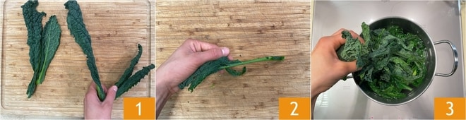 Pour préparer les pâtes avec chou noir et châtaignes, commencez par nettoyer le chou noir. Séparez les feuilles du chou 1 et retirez les tiges en les détachant délicatement de la tige 2. Ne jetez pas les tiges : elles serviront plus tard. Gardez également les petites feuilles les plus tendres. Blanchissez le chou noir dans de l'eau bouillante salée 3.