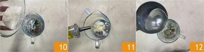 Ajoutez également le Parmigiano Reggiano DOP râpé 10, un filet d'huile 11 et un peu d'eau de cuisson du chou 12.
