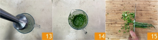 Mixez avec un mixeur plongeant 13 jusqu'à obtenir une crème lisse 14. Mettez de côté et reprenez les tiges du chou noir. Coupez-les en fines rondelles 15.