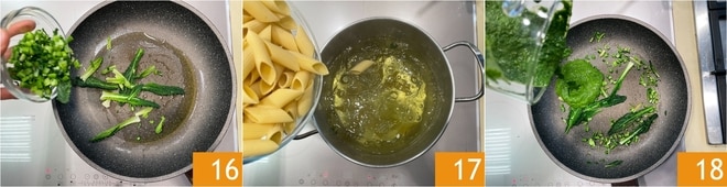 Dans une poêle, versez un filet d'huile et la demi-gousse d'ail. Ajoutez les tiges du chou noir et les petites feuilles tendres mises de côté au début 16. Ajoutez une pincée de sel et terminez la cuisson. En attendant, faites cuire les pennoni dans l'eau de cuisson du chou que vous aurez ramenée à ébullition 17. Dès que le chou sera tendre, retirez l'ail et ajoutez la crème réalisée avec les feuilles 18. Ajoutez également un peu d'eau de cuisson.