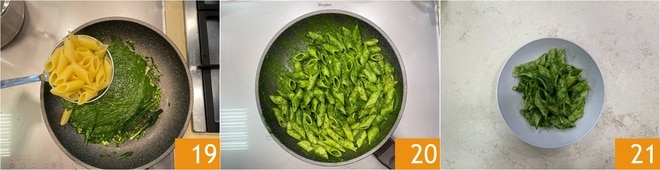 Égouttez les pennoni al dente et transférez-les directement dans la poêle 19. Faites bien sauter le tout 20, puis transférez dans les assiettes 21.