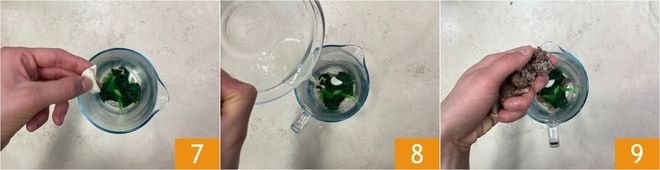 Après environ une minute, égouttez-le avec une écumoire, en gardant l'eau de cuisson de côté et transférez-le dans un bol avec de l'eau et des glaçons 4. De cette façon, en refroidissant rapidement, il conservera une couleur brillante. Maintenant, essorez-le 5 et transférez-le dans un récipient haut et étroit 6.