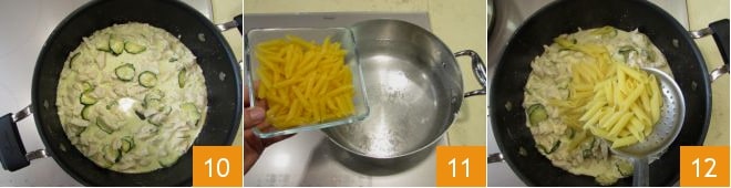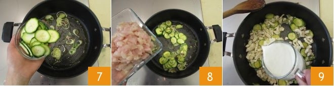 et ajoutez-les au soffritto 7. Attendez environ deux minutes et en attendant, mettez sur le feu une casserole remplie d'eau, salée à votre goût, qui servira à la cuisson des pâtes. Dès que les courgettes sont parfumées, augmentez le feu et ajoutez les dés de poulet 8. Faites cuire pendant environ 10 minutes, puis ajoutez la crème 9