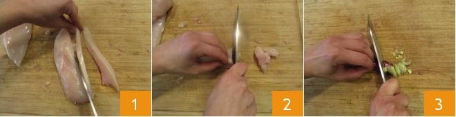 Pour préparer les pâtes au poulet et courgettes, commencez d'abord par couper le blanc de poulet d'abord en lanières 1 puis en dés 2. Ensuite, coupez le cébette en fines tranches 3