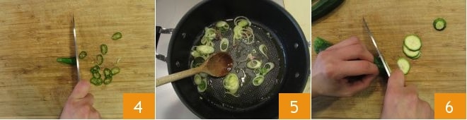 et le piment en rondelles 4. Versez l'huile dans une poêle, ajoutez à la fois le cébette et le piment et laissez-les doucement frémir 5. Pendant ce temps, coupez également les courgettes en rondelles assez fines 6