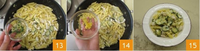 Arômatiser avec le thym 13, le zeste de 1 citron 14, sautez le tout et servez vos pâtes au poulet et courgettes encore chaudes 15.