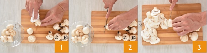 Pour réaliser les pâtes au saumon et champignons, commencez par nettoyer les champignons en les débarrassant des parties terreuses et en les frottant sur toute leur surface avec un chiffon humide 1. Coupez la base du pied 2 et tranchez-les pas trop finement 3.
