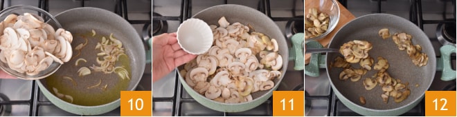 Retirez l'ail et ajoutez les champignons 10 et une pincée de sel 11. Faites cuire à feu moyen pendant 5-6 minutes en remuant souvent. Une fois prêts, mettez les champignons de côté 12. Entre-temps, mettez sur le feu une casserole pleine d'eau, portez à ébullition puis salez, ce sera pour la cuisson des pâtes.