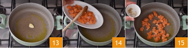 Dans la même poêle, mettez un autre filet d'huile et l'autre moitié de la gousse d'ail 13, laissez infuser une minute, puis retirez l'ail de la poêle et ajoutez le saumon 14 et une pincée de poivre blanc 15. Faites cuire pendant 3-4 minutes à feu moyen en remuant souvent.