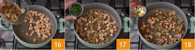 Ajoutez les champignons sautés précédemment 16, le persil haché 17, déglacez avec le vin blanc sec et laissez-le s'évaporer complètement 18.