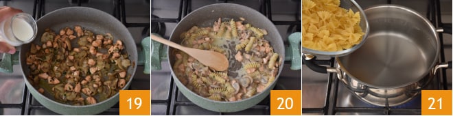 Ajoutez la crème fraîche 19 et laissez réduire la sauce, en cuisant à feu moyen pendant 2-3 minutes 20. Pendant ce temps, faites cuire les pâtes dans une grande casserole et égouttez-les 1 minute avant le temps de cuisson indiqué sur le paquet.