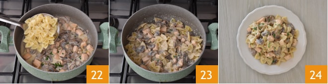 Égouttez les pâtes directement dans la poêle avec le condiment 22, mélangez quelques instants pour assaisonner 23 et servez les pâtes au saumon et champignons bien chaudes 24.
