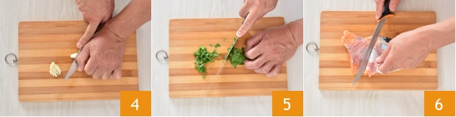 Écrasez la gousse d'ail et divisez-la en deux 4, puis mettez-la de côté. Épluchez et tranchez l'oignon, lavez et hachez le persil 5. Prenez le filet de saumon frais et retirez-en la peau 6.