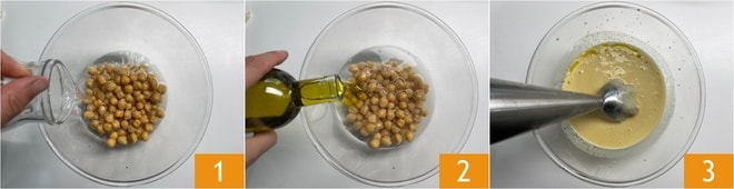 Pour réaliser les pâtes aux pois chiches et taleggio, commencez par égoutter les pois chiches précuits et transférez-en la moitié dans un bol, puis ajoutez un peu d'eau 1 et d'huile 2 et mixez avec un mixeur plongeant pour les réduire en purée 3.