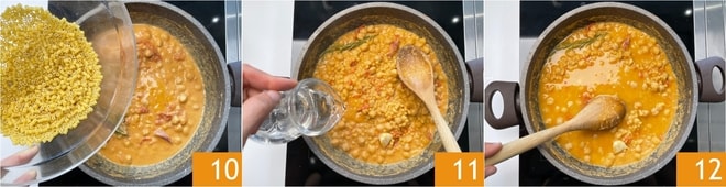 Après ce temps, ajoutez les ditalini 10 et laissez cuire encore 10 minutes, en ajoutant de l'eau si nécessaire 11 et en remuant souvent 12.