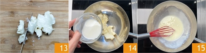 Pendant ce temps, retirez la croûte du taleggio et coupez-le en morceaux 13, puis transférez-le dans une petite casserole. Ajoutez le lait 14 et faites fondre au bain-marie, en mélangeant avec un fouet jusqu'à l'obtention d'une crème bien lisse 15.