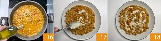 Quand les pâtes sont cuites, éteignez le feu et incorporez un filet d'huile crue 16. Dressez dans des assiettes et garnissez avec la sauce de taleggio 17 et un brin de romarin. Vos pâtes aux pois chiches et taleggio sont prêtes à être servies 18!