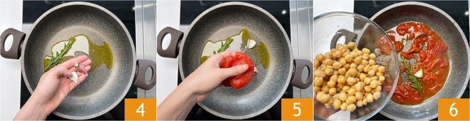 Dans une casserole, faites revenir le romarin et les gousses d'ail en chemise avec un filet d'huile 4. Écrasez les tomates pelées directement avec les mains 5 et ajoutez un filet d'eau, puis incorporez les pois chiches entiers 6.
