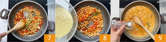 Laissez cuire pendant 5 minutes 7, puis ajoutez la purée de pois chiches 8 et mélangez. Salez 9, poivrez et laissez cuire encore 5 minutes.