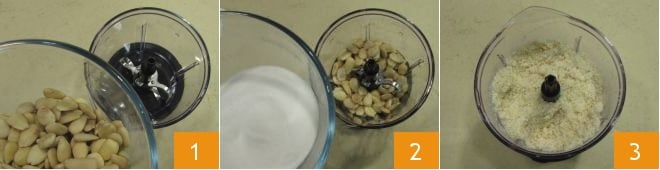 Pour préparer les pâtes d'amande, placez dans un mixeur doté de lames en acier les amandes pelées 1 et le sucre 2 et mixez jusqu'à les réduire en poudre 3. N'oubliez pas que cette étape doit durer quelques minutes pour éviter que les amandes ne chauffent trop et ne libèrent leur huile.