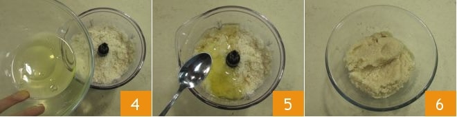 Ajoutez les blancs d'œufs 4 et l'arôme d'amande 5 et mixez à nouveau pour bien amalgamer le tout. La pâte sera prête lorsqu'elle sera compacte mais douce au toucher 6, puis transférez-la dans une poche à douille bien résistante avec une douille cannelée de 10 mm.