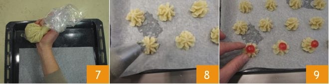 Recouvrez une plaque de papier sulfurisé que vous pouvez fixer en pressant un peu de pâte sur les 4 coins du plat 7. Formez des petits tas de 3 cm de diamètre et d'environ 2 cm de hauteur 8 et garnissez une partie d'entre eux avec les cerises confites coupées en deux 9