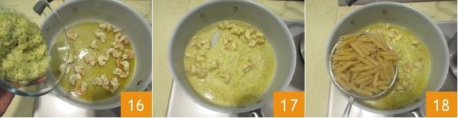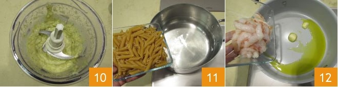 puis mixez jusqu'à obtenir une consistance assez crémeuse 10. À ce stade, l'eau sera arrivée à ébullition, alors ajoutez les pâtes 11 et faites-les cuire pendant le temps indiqué sur l'emballage. Pendant ce temps, passez à la cuisson des crevettes : dans une poêle, faites rapidement revenir les gousses d'ail avec l'huile, puis ajoutez les crevettes 12 et faites-les sauter pendant quelques minutes à feu moyen.