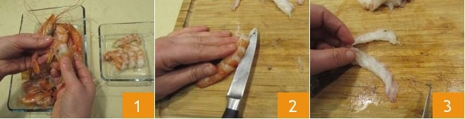 Pour préparer les penne au pesto d'amandes et crevettes, commencez par nettoyer les crevettes : rincez-les sous l'eau courante, retirez la tête et la carapace 1, puis coupez la crevette décortiquée en deux dans le sens de la longueur 2 et tirez délicatement avec la pointe du couteau le filet noir qui se trouve à l'intérieur, c'est-à-dire l'intestin 3. Pour plus d'indications, vous pouvez consulter notre école de cuisine sur Comment nettoyer les crevettes.